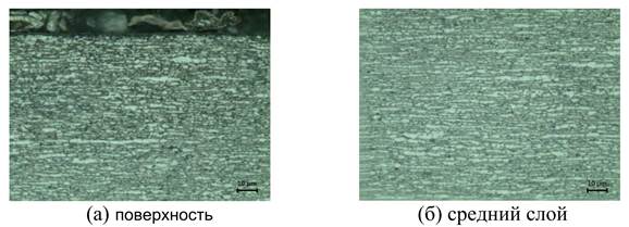 Рисунок 1. Оптические микроструктуры поперечного сечения листа дуплексной нержавеющей стали, азотированного в солевой ванне NaNO₃ при 650 °C в течение 4 часов: (a) — поверхность; (b) — средний слой