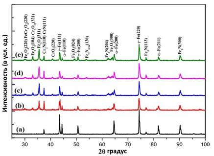 Рисунок 2. Рентгеновские диффракционные профили листов дуплексной нержавеющей стали, азотированных в солевой ванне NaNO₃ при 650 °C (без удаления оксидных плёнок): (a) — исходное состояние; (b) — после 2 часов; (c) — после 4 часов; (d) — после 8 часов; (e) — после 10 часов