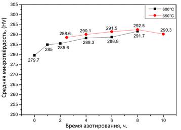 Как показано на рис. 3, среднее значение микротвёрдости азотированных листов дуплексной нержавеющей стали в солевой ванне NaNO₃ при температурах 600 °C и 650 °C в течение 0–10 часов увеличилось соответственно на 15,2 HV и 16,2 HV.