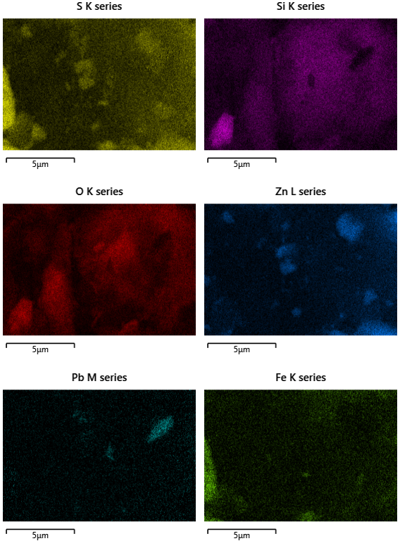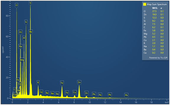 В ходе изучения был выполнен общий химический анализ образцов по всей площади каждого из них для выявления потенциальных компонентов изучаемых объектов. С помощью этих изображений был установлен размер цинковых крупинок, составляющих 100 мкм, и он, преимущественно, связан с сульфидами и пиритом, которые на рисунках 1 и 2 подтверждают данный вывод.