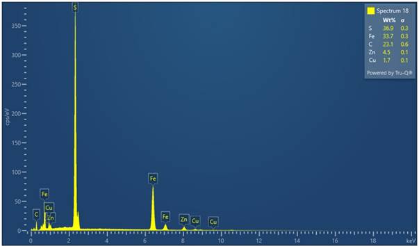 Изучаемая поверхность описывается в основном цинкью, в качестве примеси минералов железа, находящихся на пике, которые встречаются с серой, что в свою очередь образуют минералы сульфидов железа, и заметное количество их наблюдается на высоком пике интенсивностью у меди с содержанием 1,72 %, которое указывает на комплексное извлечение полиметаллических руд совместно с цинком.