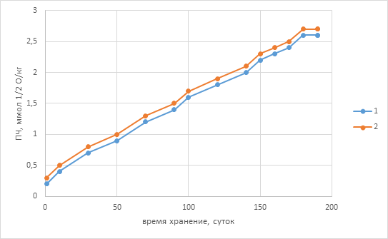 Из рис.2. можно видеть, что изменение кинетики перекисного числа связано с изменением времени хранения. Со временем растет число ПЧ, что означает ухудшение качества данного масла. В среднем, в обычных условиях срок хранения масла составляет 1-2 года. Однако, если не соблюдать условия хранения приведённые в соответствующих ГОСТах, можно ускорить ухудшения качества масла. В течении 150 суток ПЧ изменяется с 0,3 ммоль ½ О/кг до 2,8 ммоль ½ О/кг, это почти в 5 раза больше.