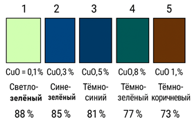 Рисунок 1. Влияние содержания пигмента CuO на формирование цвета в декоративном стекле