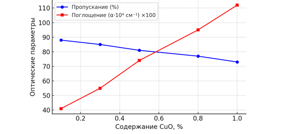 С увеличением содержания оксида меди (CuO) светопропускание уменьшается, а поглощение увеличивается. Это свидетельствует об образовании внутренних оптических центров Cu2+, которые обусловливают интенсивную окраску и снижение прозрачности декоративного стекла.