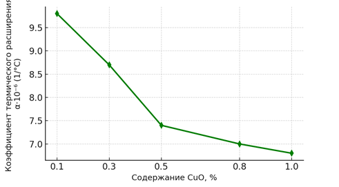 Увеличение содержания CuO в декоративном стекле приводит к снижению коэффициента термического расширения (α), что свидетельствует об улучшении термостойкости и структурной стабильности материала при нагревании. Таким образом, CuO выполняет роль стабилизирующей добавки.