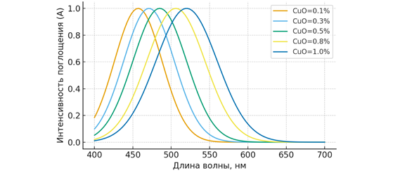С увеличением содержания CuO максимум поглощения (λₘₐₓ) смещается в длинноволновую область (от 450 до 550 нм), что свидетельствует об увеличении концентрации ионов Cu²⁺ в матрице стекла и усилении эффекта окрашивания. Этот сдвиг характерен для образования медьсодержащих оптических центров.
