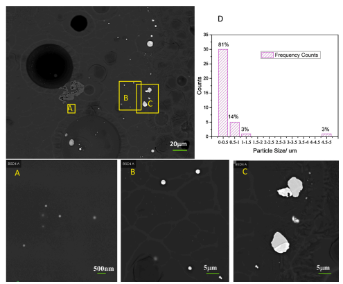 На рисунке 5 показана морфология (A, B, C) и распределение по размерам (D) частиц пигмента CuO, расположенных в поверхностном слое и внутренней матрице декоративного стекла. На основании микрофотографий, полученных с помощью СЭМ (A–C), установлено, что частицы в основном расположены в диапазоне 0,1–0,5 мкм, что составляет 81 % от общего объема. Такое мелкодисперсное распределение обеспечивает равномерное поглощение света и стабильность цвета.