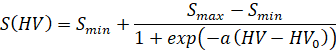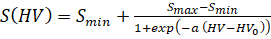На рис. 2 показаны зависимости S(HV) для кусочно-линейной (рис. 2а) и логистической (рис. 2б) моделей. Нужно не обращать внимание на низкие значения S до значений HV ≤ 95, это не рабочий интервал.