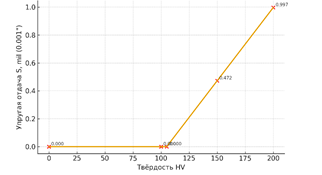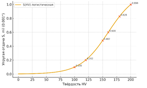 ″/HV. Однако кусочно-линейная аппроксимация, по нашему мнению, слишком груба. Физически логичнее S-образная зависимость: при малых HV (полный отжиг) упругость низка и растёт медленно, в области умеренного наклёпа рост ускоряется, при сильном наклёпе снова замедляется и выходит на насыщение (ограничение по