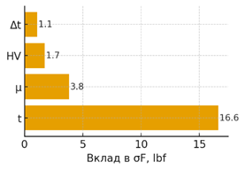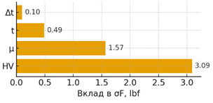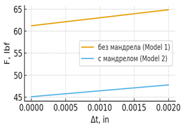 Неравностенность Δt при одинаковой средней толщине влияет на сопротивление растягивающему давлению. При фиксированном t рост Δt повышает усилие посадки [2]. Учтём это через эффективную толщину дульца: