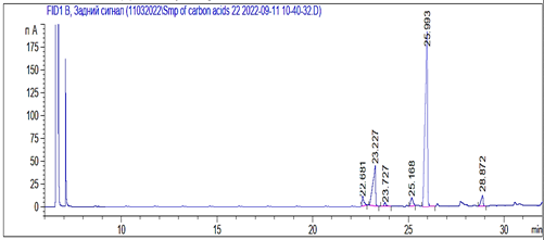 Результаты и их обсуждение. Спектр газовой хроматографии смешанной дистиллированной жирной кислоты (ДЖК), образующейся в качестве вторичного продукта при переработке растительного масла на масложировом комбинате нашей республики (Каттакурганский масложировой комбинат), был исследован на приборе Agilent Technologies 6890 N, оснащенном пламенно-ионизационным детектором.