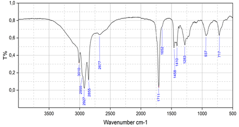 На основании анализа ИК-спектра установлено, что полученное вещество представляет собой ненасыщенную высшую карбоновую кислоту. Наблюдается широкая полоса поглощения при 3009 см−1, характерная для валентных колебаний группы -ОН. Полосы поглощения при 2927 и 2854 см−1 соответствуют валентным колебаниям связи С–Н, а полоса при 2854 см−1 асимметричным колебаниям метиленовой группы (СН2). Подтверждено наличие сигналов, характерных для валентных колебаний связи С=О, в области поглощения при 1710 см−1 (рис. 2).