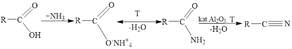 Существует несколько лабораторных и промышленных способов получения нитрилов жирных кислот: путем обезвоживания (дегидратации) амидов жирных кислот, дегидрированием при 500∘C с добавлением катализатора Al2O3 [3; 423с], путем обезвоживания (дегидратации) альдоксимов, методом синтеза Ван Эса [4; 396-397с], синтезом Кольбе, декарбоксилирующим цианированием [5; 1790-1800с] с использованием фотокатализатора Ir (иридий) в присутствии цианобензиодоксилонов, восстановлением кислоты до альдегида гидридами металлов с использованием солей галогенидов аммония [6; 5886-5892с, 7; 2288-2292с], процессом аммонизации-обезвоживания (дегидратации) [8; 1478-1489с], а также процессом транс-нитрилирования, то есть заменой функциональных групп без катализатора [9; 9705-9714с, 10; 10567-10571с].получают нитрилы жирных кислот.