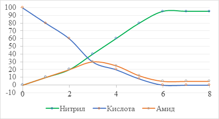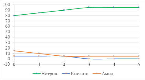 Реакция проводилась в интервале от одного до восьми часов при температуре 180∘C и количестве катализатора 3% по отношению к исходному сырью. При этом можно увидеть, что наиболее оптимальное время составляет 6 часов. При продолжительности реакции 6 часов выход составил 95,45%, а при более длительном времени выход начал очень медленно снижаться, что объясняется нестабильностью нитрила при высокой температуре и длительном времени. (Рисунок 4).