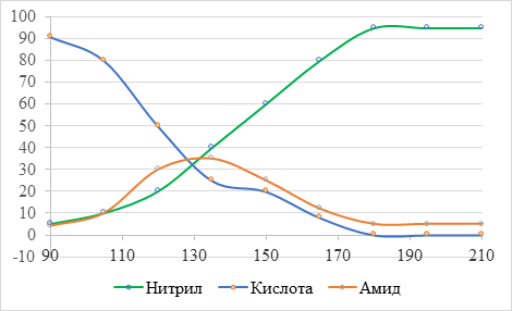 На основе приведенной реакции с использованием катализатора Al2O3 была поэтапно проведена реакция нитрилирования жирных кислот с C16 и C18 атомами углерода, и изучены оптимальные условия.