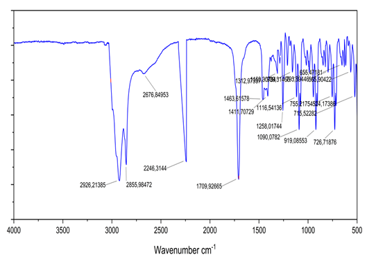 Полученные нитрилы жирных кислот — были проанализированы методом инфракрасной спектроскопии на спектрометрах "Agilent Technologies Cary 640 Series FTIR" с ИК-спектральным диапазоном 4000–400 см−1 (Рисунок 6). Анализ ИК-спектра нитрила жирной кислоты показал следующее: полоса поглощения при 2246 см−1 подтвердила наличие нитрильной CN группы.