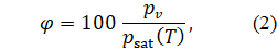 — парциальное давление водяного пара. На рис. 2 представлена относительная влажность при нагреве воздуха с постоянным содержанием воды. При постоянном абсолютном содержании воды изменение температуры меняет только знаменатель (ёмкость), и