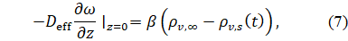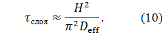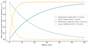 Примем банку с широким горлышком (1 кг, горлышко ~50 см²). Толщина столба ~20–25 см, тогда время τ насыщения поверхностного слоя часы, глубоких слоев порядка недель–месяцев. Средняя влажность всей массы меняется очень медленно, за сутки–двое адаптируется лишь верхняя часть столба [3, 11]. Верхние слои реагируют быстрее, характерное время часы, но средняя влажность всей массы меняется с характерным временем недель (рис. 5). Перемешивание такого пороха перед снаряжением патронов усреднит его влажность и в среднем немного уменьшит.