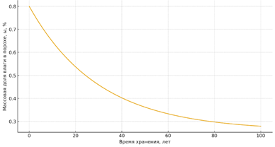 Рассмотрим, что происходит с изменением массовой доли влаги в порохе патрона после посадки пули. Капсюль и пуля не обеспечивают идеально полную герметичность патрона, но микрощели очень малы. На рис. 7 представлен график изменения влажности пороха в патроне, (медленное высыхание пороха при помещении патрона в сухую среду) когда обмен влаги с внешней средой крайне слабый. По нему видно, что изменения могут идти годами и десятилетиями. Мы приняли: начальная влажность пороха в патроне: