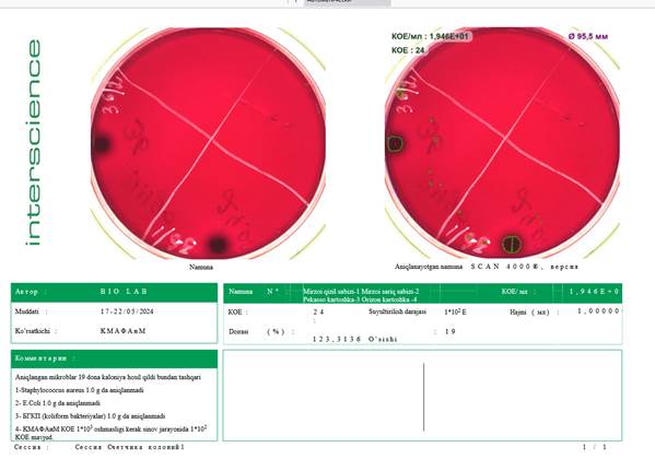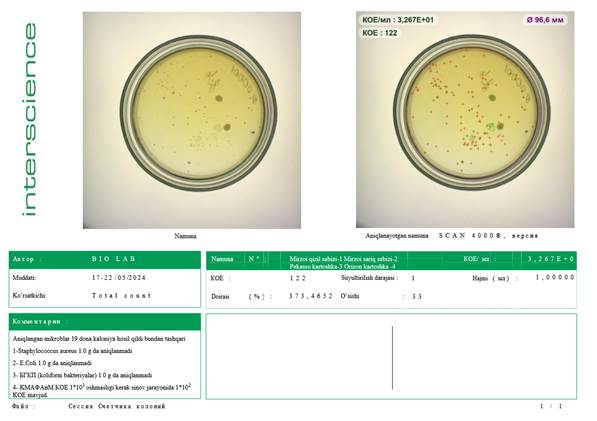 В заключение, общее количество микроорганизмов в данном образце очень низкое (≈19 КОЕ/мл), а продукт считается микробиологически чистым и безопасным.
