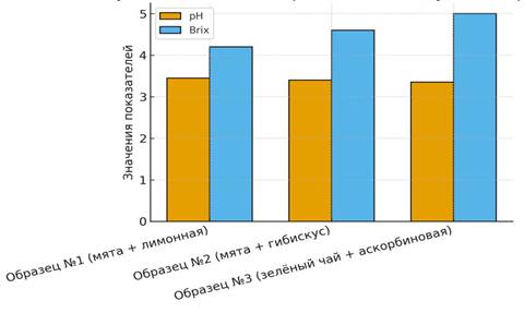 Результаты и обсуждение. Исследованы три варианта напитков с различными растительными экстрактами. Оптимальные показатели кислотности и антиоксидантной активности достигнуты в образце с экстрактом зелёного чая и аскорбиновой кислотой. Ниже представлена таблица с основными характеристиками исследованных образцов.