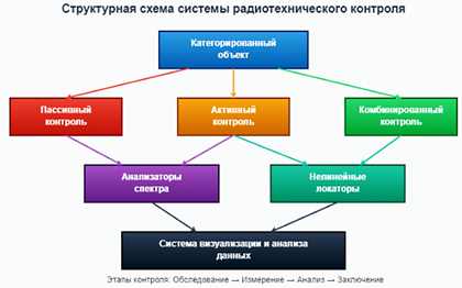 Методика проведения радиоконтроля включает несколько этапов: предварительное обследование объекта, инструментальные измерения, анализ полученных данных и формирование рекомендаций по усилению защиты [7]. Периодичность проведения радиоконтроля определяется категорией объекта и требованиями нормативных документов.
