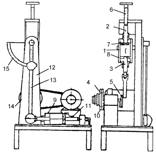 Эксперимент проводился на специально разработанном стенде ( рис 2), который представляет собой цилиндр 1, залепленный на стойке прибора, в который помещают навеску хлопка. Образец деформируется двумя пуансонами, один из которых 2 под действием винта 6 обеспечивает предварительное уплотнение хлопка, а второй 3, соединенный с механическим вибратором, осуществляет периодический режим нагружения. Частота нагружения регулируется сменными шкивами 4, амплитуда деформации изменяется сменными эксцентриками 5. Давления, воздействующие на образец, измеряются тензодатчиками 7 и 8, закрепленными на мембранах пуансонов.