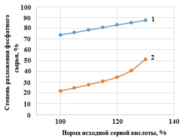 Повышение нормы серной кислоты способствует снижению содержание P2O5общ. с 15,00% при норме кислоты 100% до 13,08% при норме 130% (табл. 1). При этом содержание P2O5усв. повышается незначительно с 11,07% до 11,44%, тогда как содержание P2O5в.р. увеличивается с 3,31% до 6,73%, H3PO4своб. с 0,13% до 1,32%.