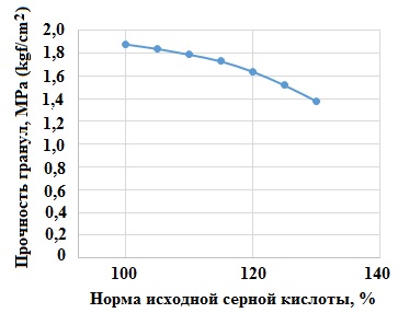 Рисунок 2. Влияние нормы исходной серной кислоты на прочность гранул кислого суперфосфата