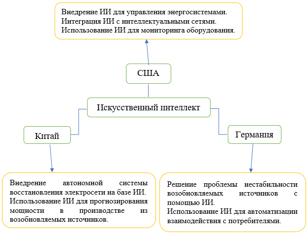 Так, например внедрение искусственного интеллекта в энергосбытовые компании происходит в разных странах, включая Китай, США и Германию Рисунок 1. В данных странах технология внедрения ИИ используется для оптимизации генерации, распределения и потребления электрической энергии, автоматизации процессов и снижения нагрузки на сотрудников.