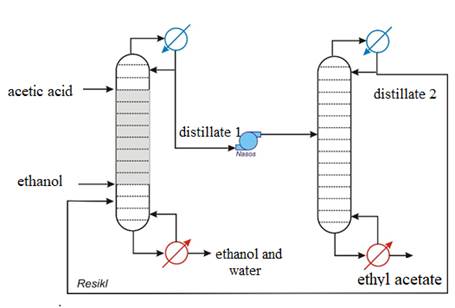 Figure 1 shows the technological scheme of ethyl acetate production based on a reaction rectification sequence. In the first column, ethanol and acetic acid are brought into contact under conditions that allow esterification to proceed while, at the same time, part of the light components is separated.