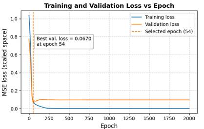 Model parameters were optimized using the Adam algorithm, which adaptively adjusts the learning rate of each weight during training, ensuring fast and stable convergence even with a limited number of samples. The mean squared error (MSE) was chosen as the loss function to penalize larger prediction errors more strongly and facilitate smooth optimization. The training process was conducted for up to 2000 epochs, with simultaneous monitoring of both training and validation losses. To prevent overfitting on the small dataset, an early-stopping mechanism was applied. When the validation loss stopped improving, the model state corresponding to the minimum validation error was stored as the final configuration. This approach ensured that the model not only performed well on the training data but also generalized effectively to unseen operating conditions.