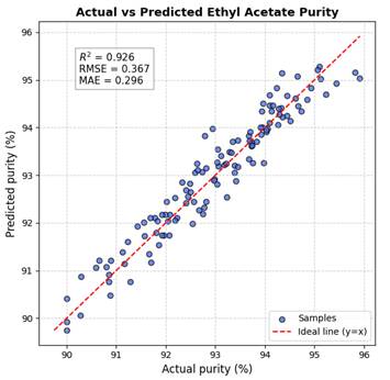 Figure 3. Actual versus predicted ethyl acetate purity (%)