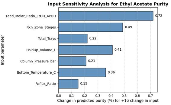 Finally, to interpret the trained neural model and assess the influence of each process parameter on the final product quality, a sensitivity analysis was conducted. In this analysis, each input variable was independently perturbed by one standard deviation around its mean while keeping the others constant. The resulting change in predicted purity was calculated to determine the system’s sensitivity to that variable. The sensitivity values were represented in a horizontal bar chart, highlighting which parameters exerted the most significant effect on ethyl acetate purity. This interpretation step links the data-driven neural model with the physical understanding of the process and helps identify which operational variables are most critical for process control and optimization.
