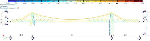 Figure 2. Longitudinal N stress distribution of the suspension-cable-stayed bridge