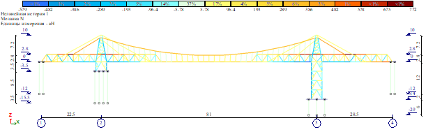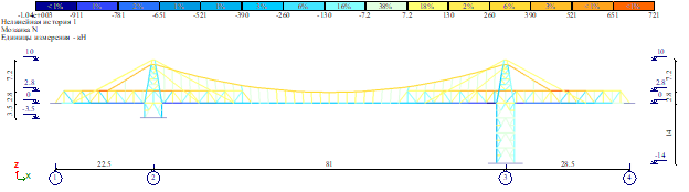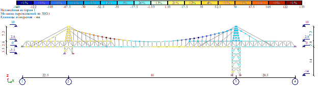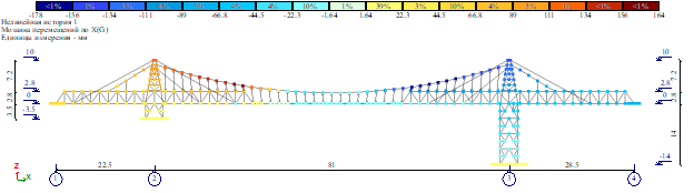 The main load-bearing structures of the suspension-cable-stayed bridge were analyzed using the LIRA-SAPR software, considering the geometric nonlinear behavior of the structure and the susceptibility of its supports to displacement.