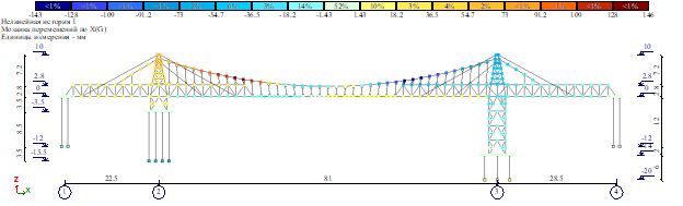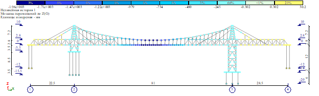 Comparison of LIRA-SAPR analysis results for the 81 m span suspension bridge. |