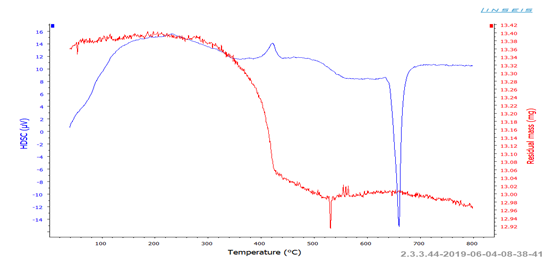 Термические свойства алюкобонд исследованы методом дифференциально–термогравиметрического анализа (TG + DSC) на приборе Linseis STA PT 1600 в диапазоне 30–800 °C при скорости нагрева ~20 °C/мин, что обеспечивало достижение 660 °C примерно за 30 минут, на основе изменения тепловых эффектов. Прибор позволяет в одном эксперименте для одного и того же образца проводить анализ изменения массы и тепловых потоков. Сочетание методов термогравиметрического анализа (ТГА) и дифференциальной сканирующей калориметрии (ДСК) позволяет определить: (1) изменение массы образца и величину массового остатка после термовоздействия; (2) теплоту плавления кристаллических веществ, температуру стеклования полимерных материалов; характеристики термического старения; чистот у веществ, атак же различные фазовые переходы, и полиморфные превращения, идентификацию материалов по набору их теплофизических характеристик. Дериватограммы компонентов алюминиевых композитных панелей представлены: на рис. 1 – для полимерной части алюкобонда, на рис.2- для металлической части.