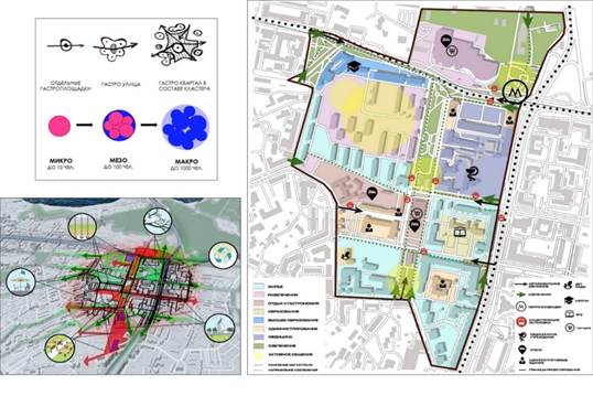 Заключение. Исходя из существующей ситуации, предполагается сценарий развития, где отдельные единицы складываются в крупные объекты с большим радиусом влияния и становятся драйвером развития и эффективного использования данного участка города. Формирование микро-пространств в крупные мезо-гастро кластеры становится основой логичного функционирования макро-социума и помогает выстроить тенденцию освоения деградирующих территорий, нуждающихся в реконцепции. Формирование живописных комплексов и маршрутов – важная часть решения проблемы вовлечения городской среды и артикуляции новых точек притяжения.