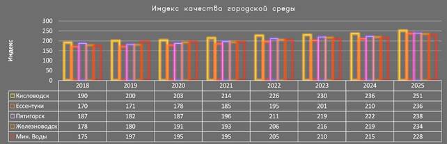 Кроме того, сравнение индексов качества городской среды городов-курортов и города Минеральные Воды за 2018-2025 год показывает, что с 2018 до 2024 год показатель индекса Минеральных Вод был выше, чем в Ессентуках, а в 2025 он сопоставим с индексом Железноводска (рис. 2). При этом, показатели Кисловодска в течение всего периода был неизменно выше, чем во всех других городах агломерации.