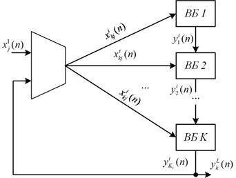 Последовательно-параллельная архитектура нейронной сети. Предлагаемая схема умножения с накоплением соответствует последовательно-параллельной архитектуре нейронной сети «многослойный персептрон» в виде массива вычислительных блоков (ВБ) (рисунок 1), описанной в [9] для нейронных сетей, работающих в формате с фиксированной запятой. Каждый ВБ содержит одну схему умножения с накоплением и вычислитель функции активации, что соответствует одному нейрону. Количество ВБ в массиве K определяется слоем нейронной сети с максимальным количеством нейронов. В каждый момент времени все ВБ принимают один из входных сигналов сети,