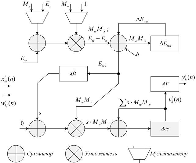 . По окончании вычислений в текущем слое сети массив ВБ используется для вычислений в следующем слое, и т.д. Схема умножения с накоплением в составе ВБ выполняет вычисление