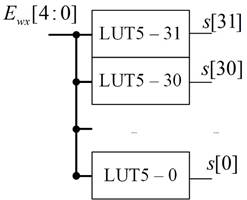 Устройство вспомогательного блока sft, формирующего коэффициент s, представлено на рисунке 4. Блок представляет собой набор из тридцати двух 5-входовых таблиц истинности (LUT5), каждая из которых формирует один разряд s.