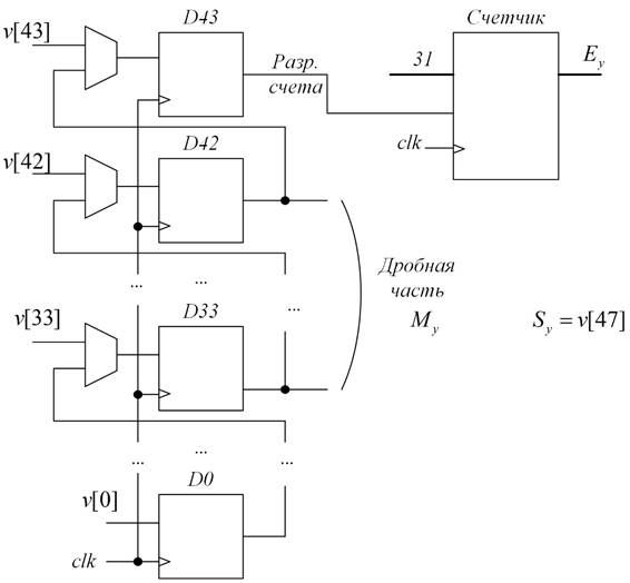 , и счетчик экспонент, работающий в режиме вычитания, в который на старте работы помещается значение 31. соответствующее единице в 43-м разряде