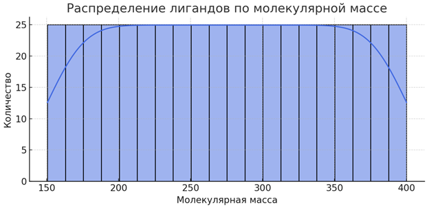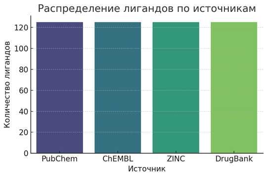 Анализ состава базы показал, что соединения распределены по источникам равномерно: по 125 лигандов из каждой базы (PubChem, ChEMBL, ZINC, DrugBank). Распределение молекулярной массы носит постепенный характер: наибольшее количество соединений относится к диапазону 150–300, что соответствует типичным лекарственно-подобным соединениям.