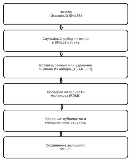 Для генерации новых соединений был реализован простой, но эффективный алгоритм (рисунок 3) мутации SMILES. Алгоритм включает следующие этапы: