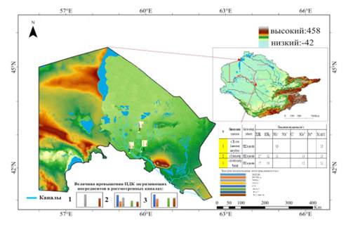 Рисунок 1. Карта превышения ПДК загрязняющих элементов в воде каналов Дустлик (1), Суенли (2), Кегейли (3) в 2023-2024 гг.
