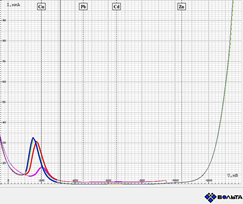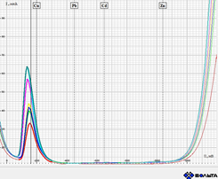 Измерения проводили на вольтамперометрическом анализаторе Volta ABC 1.1 с трёхэлектродной ячейкой: стеклоуглеродный рабочий электрод с in situ формируемой ртутной плёнкой, платиновый вспомогательный электрод и электрод сравнения Ag/AgCl. Параметры измерений соответствовали установленным режимам.
