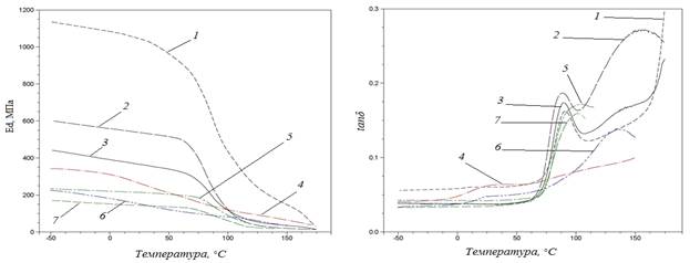 Рисунок 1. Результаты динамического механического анализа звукопоглощающих композитов, содержащих компоненты природного (растительного) происхождения