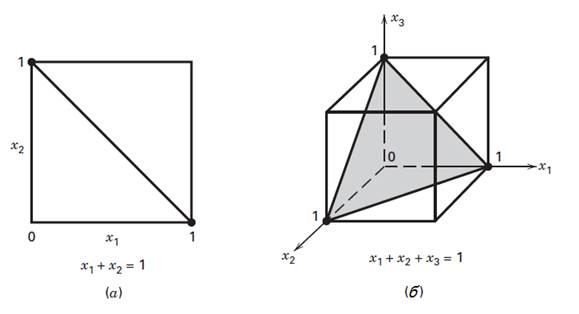 Рисунок 2. Ограниченное факторное пространство для двухкомпонентной (а) и трехкомпонентной (б) смесей
